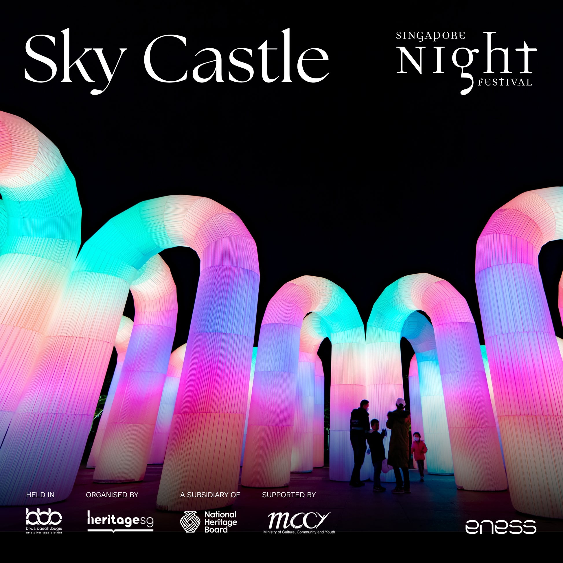 Sky Castle is a dreamy, interactive sound and light installation, featuring a cluster of inflatable arches that span in colourful symphony across public space.
